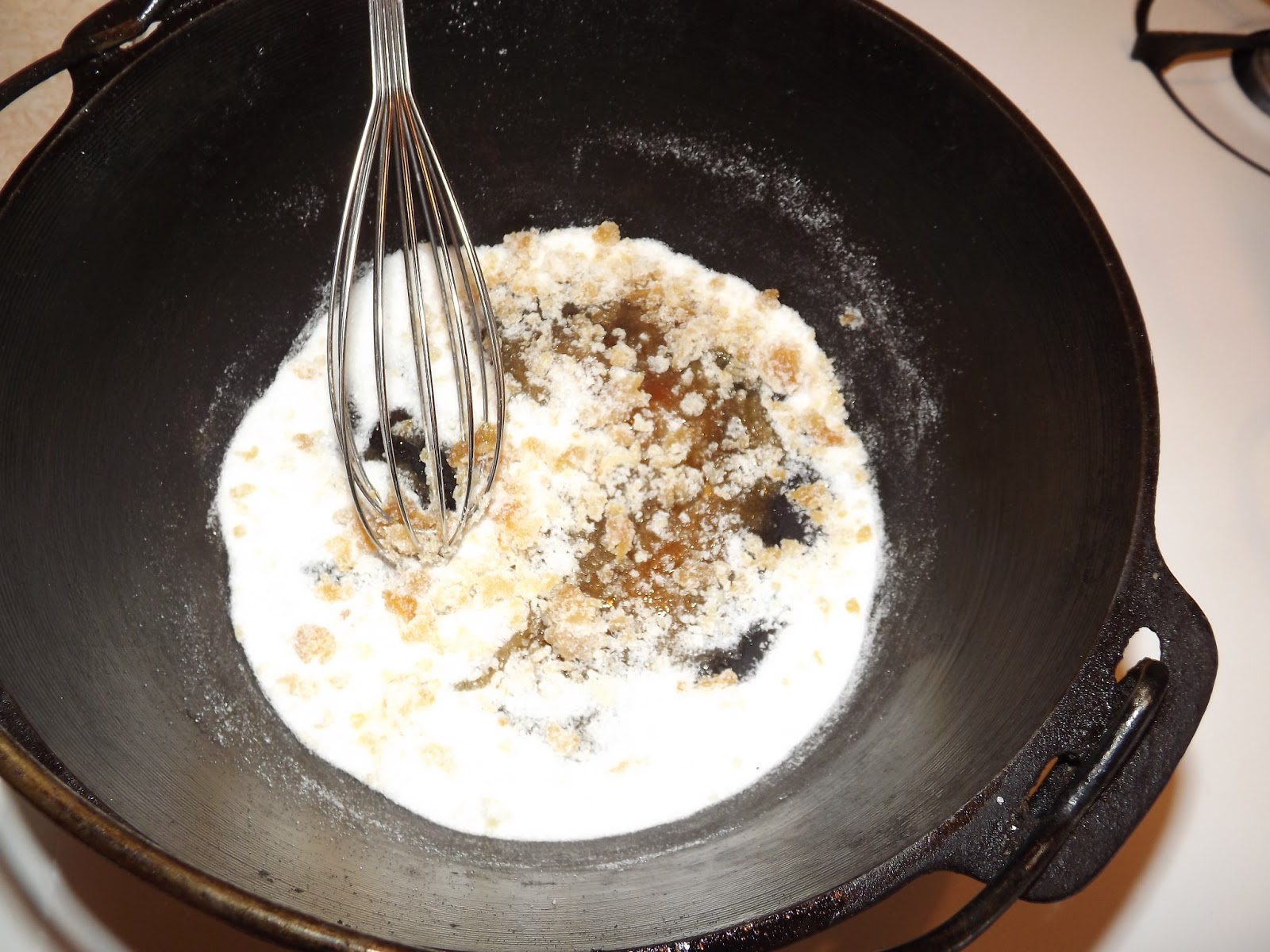 Place the 3/4 cup sugar in a cast iron dutch oven or frying pan.